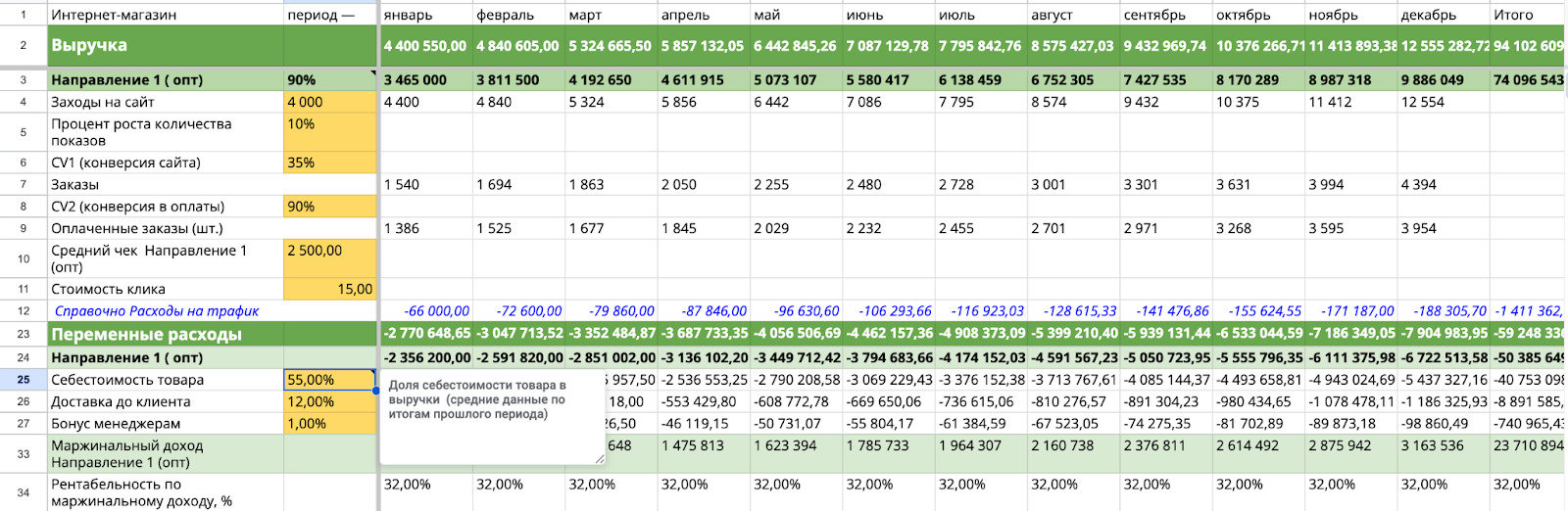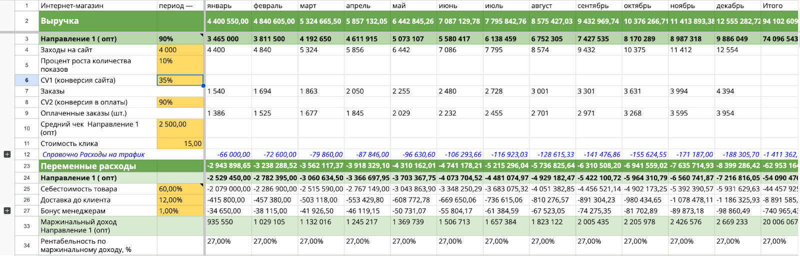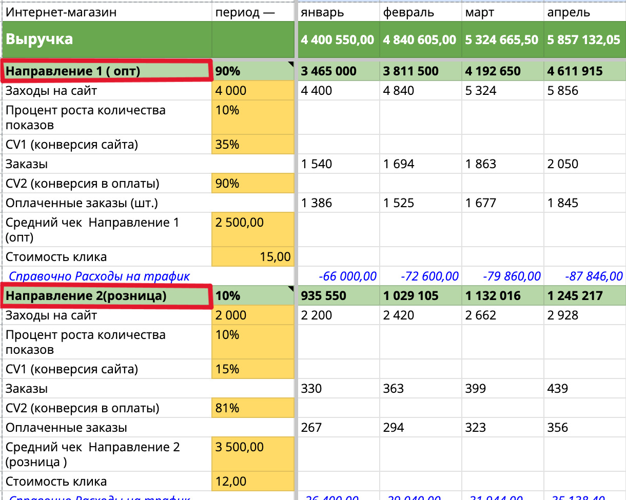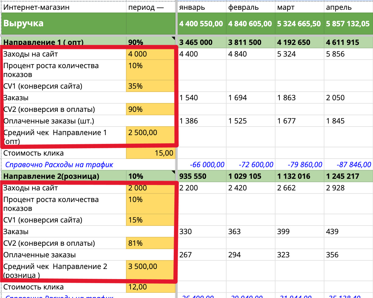 Начинайте заполнять финмодель с доходов. Детализируйте потоки, стройте воронки продаж по каналам.