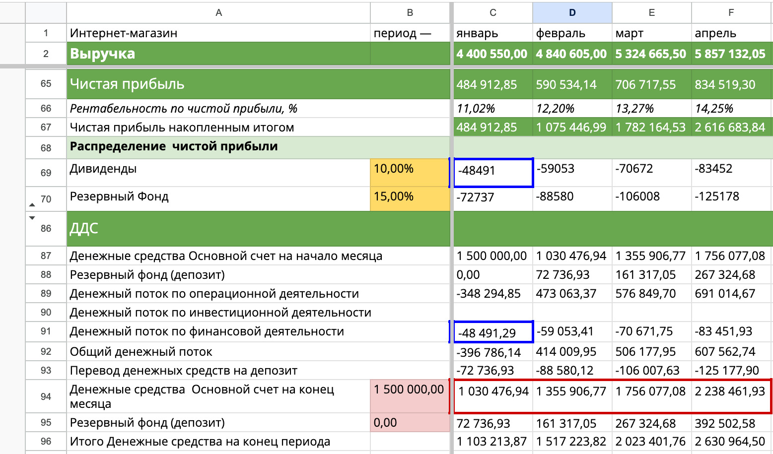 После того как мы подсчитали чистую прибыль в финансовой модели, можно заложить ее распределение, например: процент собственнику (дивиденды), в резервные фонды, на развитие, на приобретение оборудования, на подушку безопасности и прочие направления. В нашем примере размер дивидендов составляет 10%, а размер ежемесячного пополнения резервного фонда — 15%.