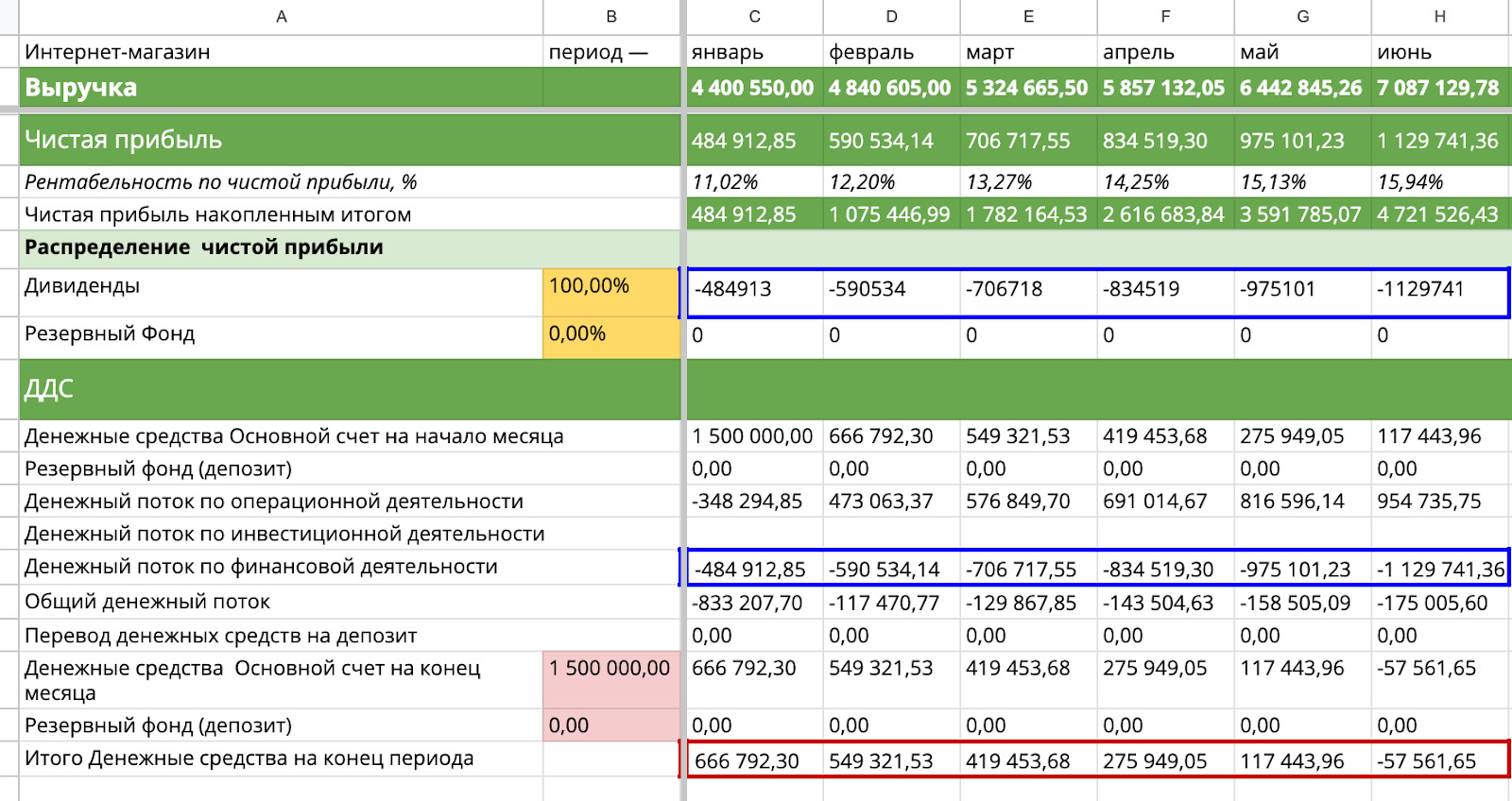 Чтобы увидеть чистую прибыль компании, которая остается у владельцев, смотрим в блок «чистая прибыль». В нашем примере «чистая прибыль накопленным итогом» составляет 15 730 755 руб. — столько магазин заработал за год.