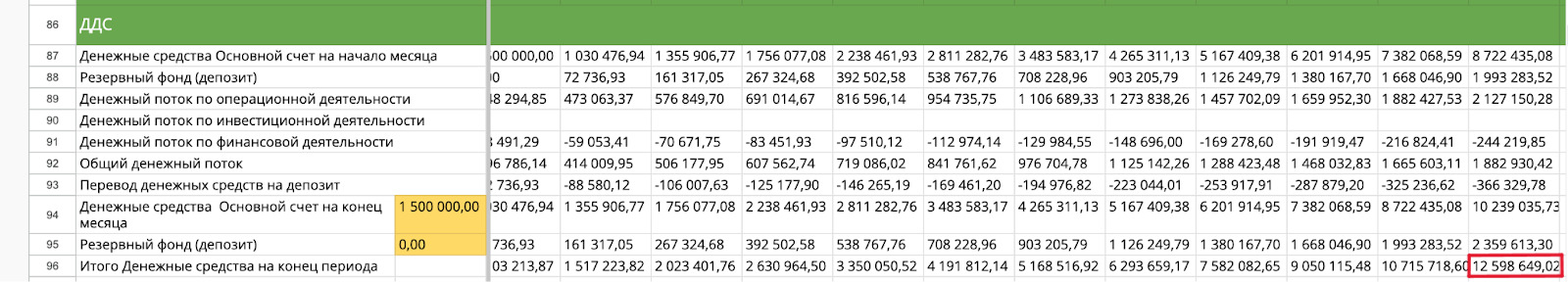 Итоговый денежный поток: сумма потоков по всем трем видам деятельности. В финмодели он положительный и имеет нарастающий итог к концу года. Если посмотрим на декабрь, то остатки денежных средств по всем счетам составляют 12 598 649 руб. Это не деньги собственника, это деньги бизнеса из которых мы будем покрывать все расходы и поддерживать запасы в оптимальном состоянии.