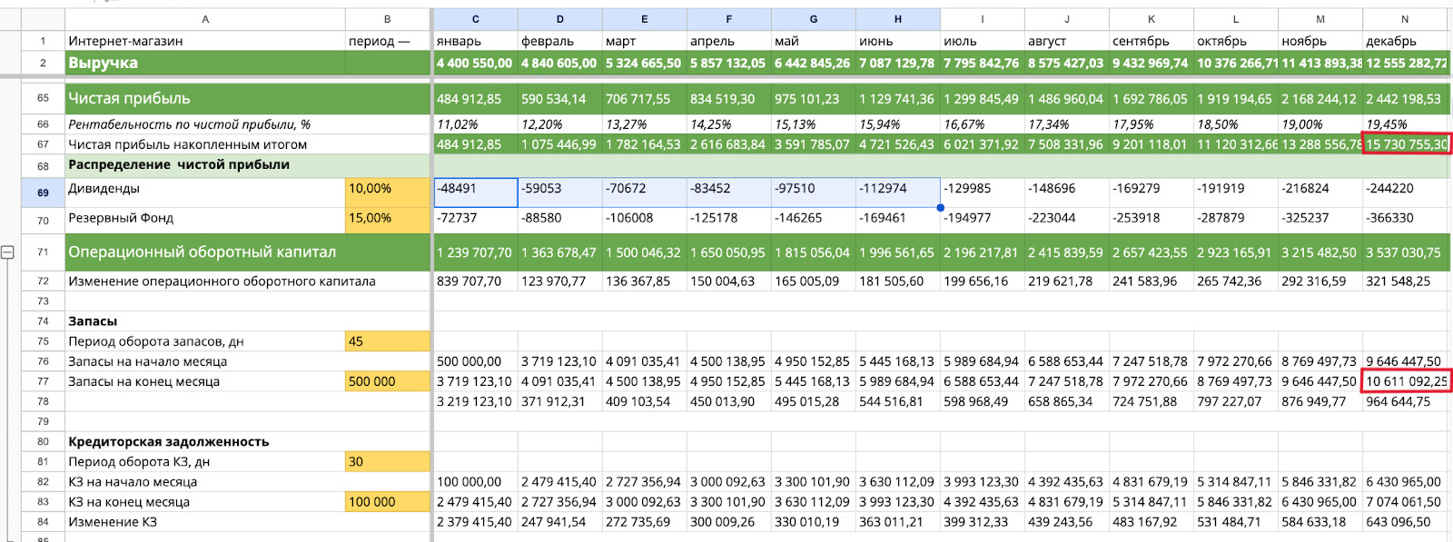 Они «заморожены» в товарных запасах. В нашем примере стоимость запасов на конец года — 10 611 092 руб. Часть чистой прибыли (те самые ~3 млн руб.) вложена в товары, чтобы обеспечить продажи в следующем месяце.