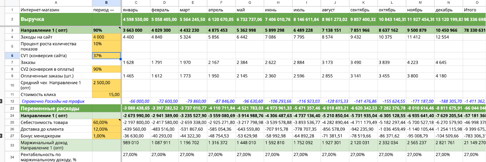 Если здесь допустить ошибку и взять цифры с потолка, то все, что ниже — расходы, прибыль, денежный поток — превращается в красивый, но бесполезный карточный домик. Разберем на живом примере — возьмем интернет-магазин и посмотрим, как цифры из таблицы складываются в реалистичную картину доходов.