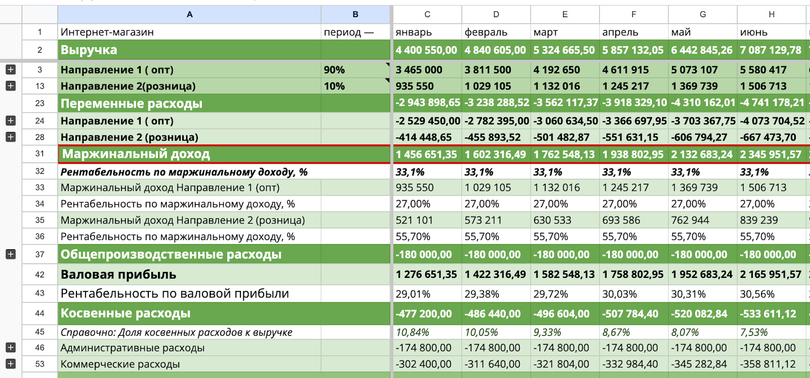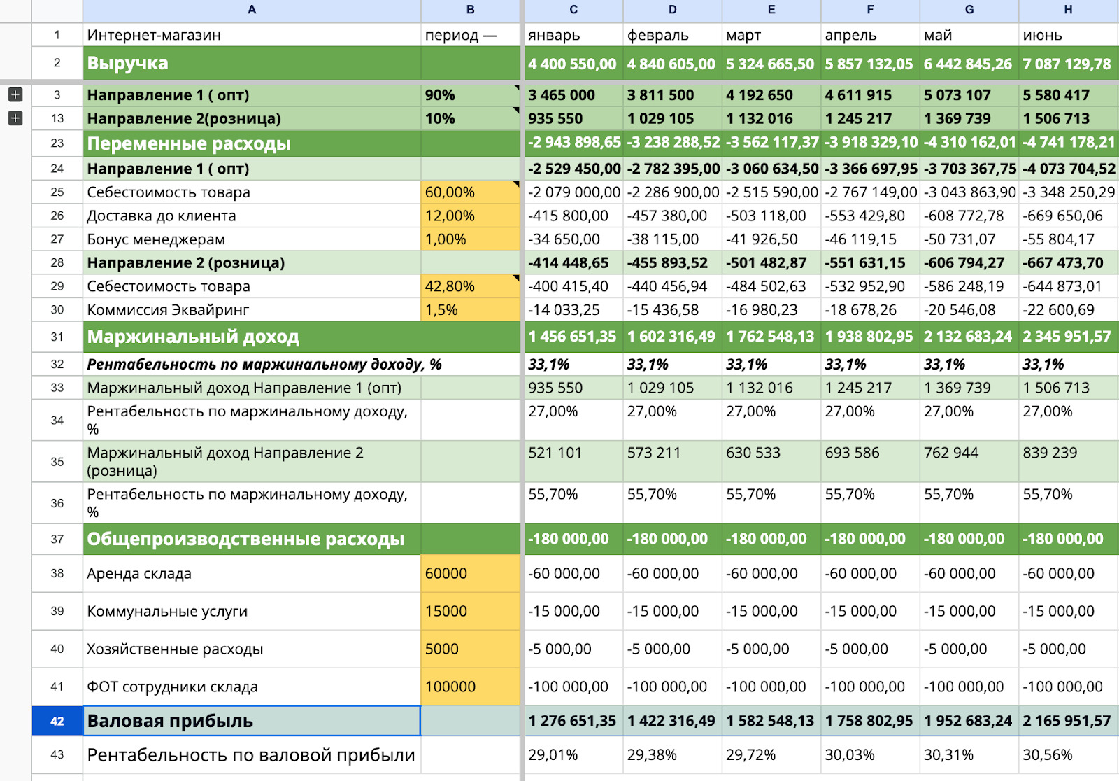 Зачем это в финмодели? Чтобы четко видеть, на каких продуктах/направлениях держится бизнес сейчас (сейчас оптовые продажи рулят!!) и как это может измениться завтра.