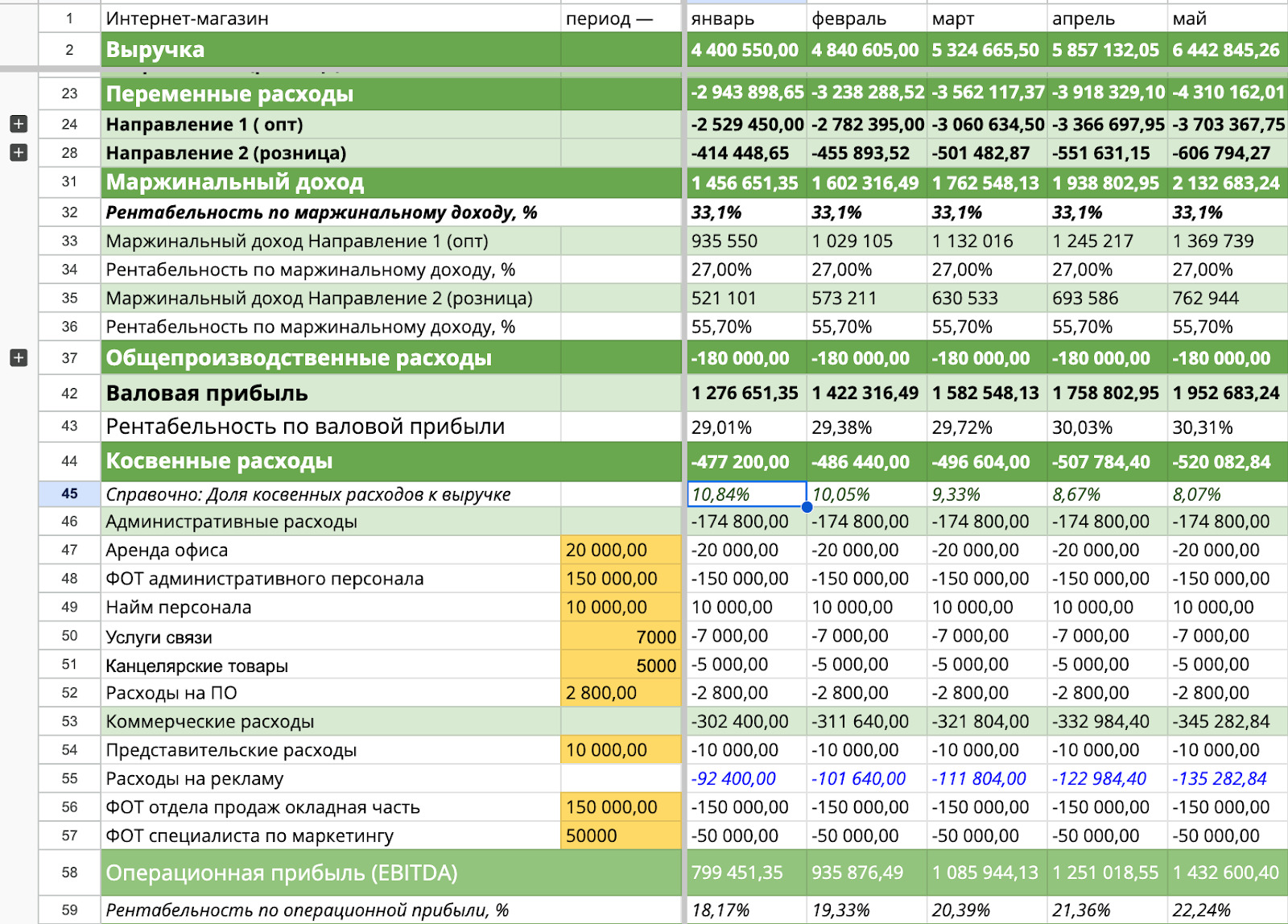 Доля косвенных расходов в выручке должна снижаться по мере роста бизнеса — это означает что постоянные расходы мы не раздуваем с ростом продаж и стараемся держать на одном уровне . Пример расчета за январь из нашего кейса: