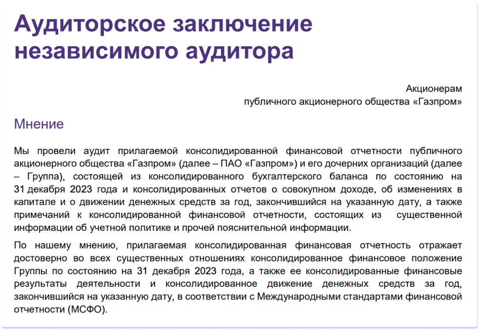 Финансовая отчетность Газпрома по МСФО опубликована с заключением аудитора