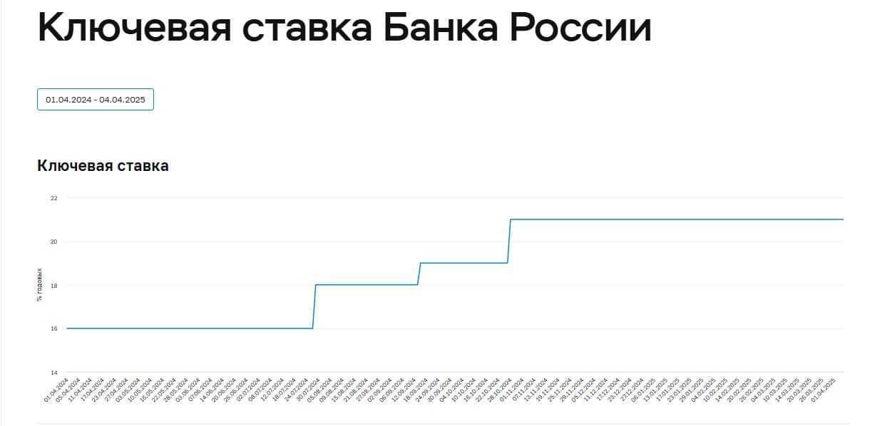 ↑ Ключевая ставка всё время меняется: то снижается, то растет, но вот с апреля 2024 года она выросла с 16% до 21%, по данным Центробанка