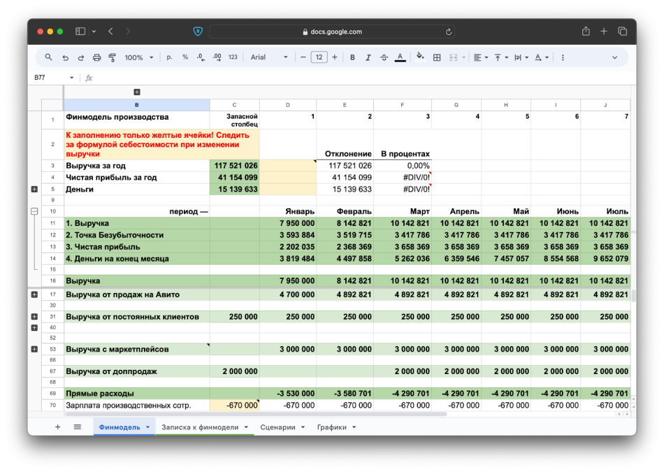 Финансовая модель фермерского хозяйства — это документ, в котором рассчитывают главные финансовые показатели компании: доходы, расходы, воронку продаж, денежный поток и оборотный капитал. Вот как выглядит финансовая модель: