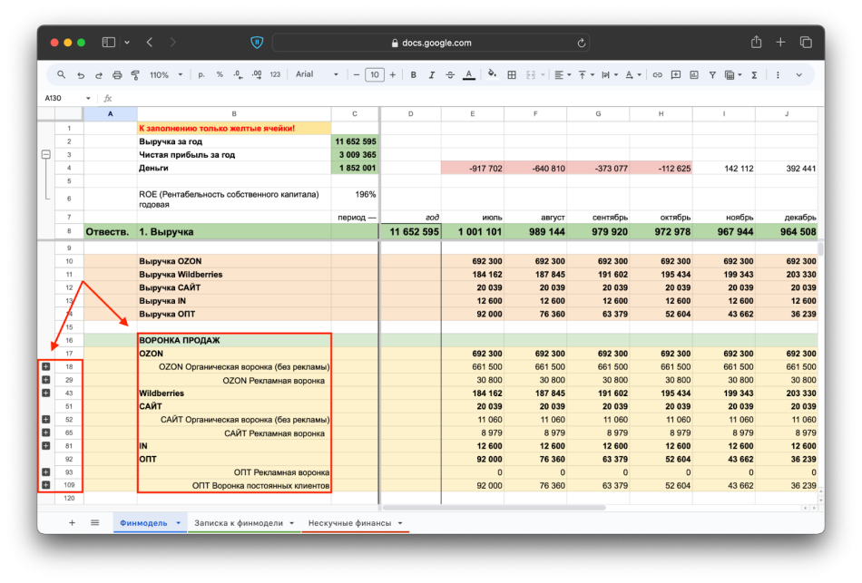 → Пример 1. Посмотреть, какие каналы продаж работают и сколько денег они приносят. В финмодели интернет-магазина выручка детализируется по разным каналам и воронкам продаж. Например, можно увидеть, что столько-то клиентов приходят органическим путем, а столько-то приносит реклама. При этом реклама на сайте не дает такого выхлопа, как в соцсетях, а торговля на маркетплейсах даже с высокими расходами приносит больше всего денег.