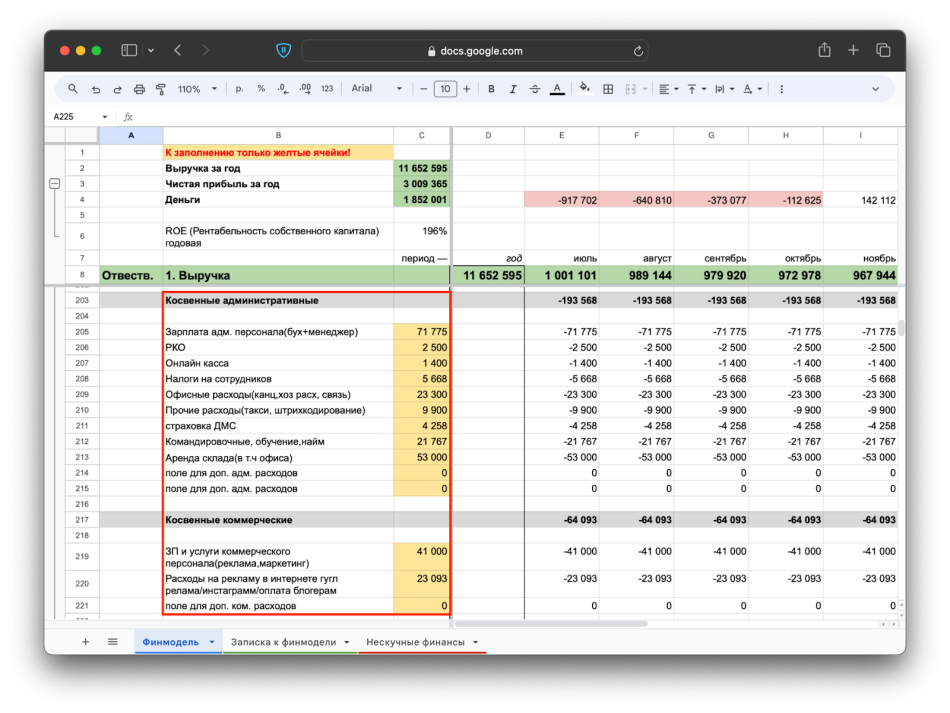 Для финансовой модели интернет-магазина понадобится эксель- или гугл-таблица с нужными графами, блоками и формулами. Советуем скачать наш бесплатный шаблон, сделать себе копию и возвращаться обратно в статью, чтобы по ходу заполнять свой файл ↓