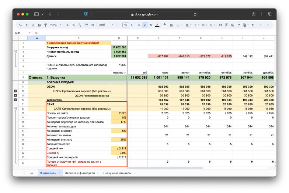Дальше по шагам разберем, как составить финмодель интернет-магазина.