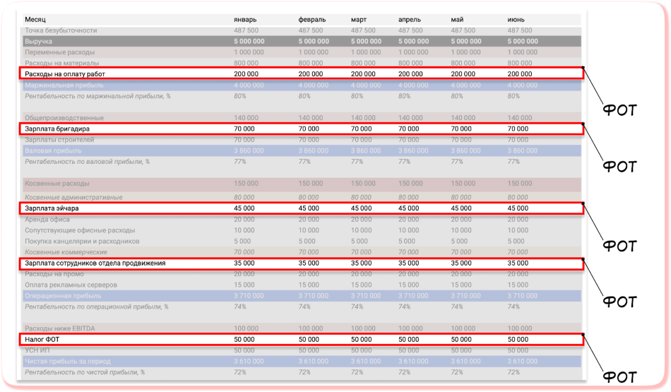 Расходы на ФОТ (и ФЗП соответственно) в ОПиУ находятся выше чистой прибыли — это значит, что эти расходы оплачиваются из выручки или валовой прибыли. И уменьшают чистую прибыль компании.