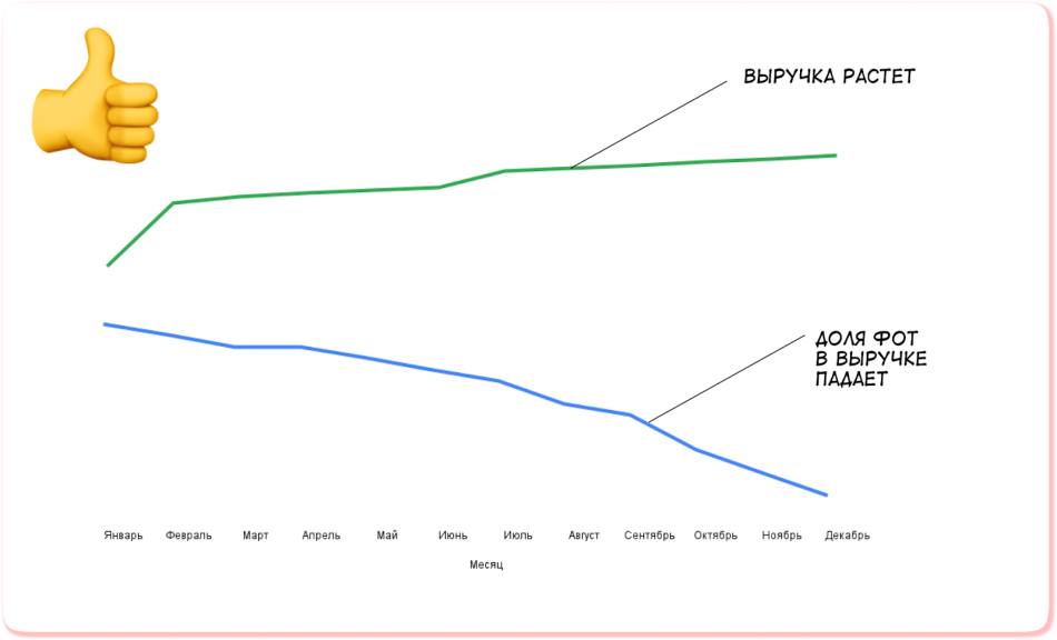 Сценарий 1. Выручка растет, а доля ФОТ в выручке снижается. Это идеальный вариант. Если доля ФОТ снижается, а выручки компания получает все больше и больше, значит, каждый сотрудник в команде работает максимально эффективно.