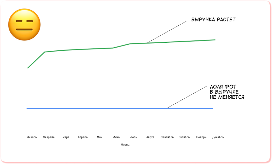 Сценарий 2. Выручка растет, доля ФОТ не меняется, — нормальная ситуация, хотя не идеальная. Означает, что команда работает достаточно эффективно, но есть куда расти.