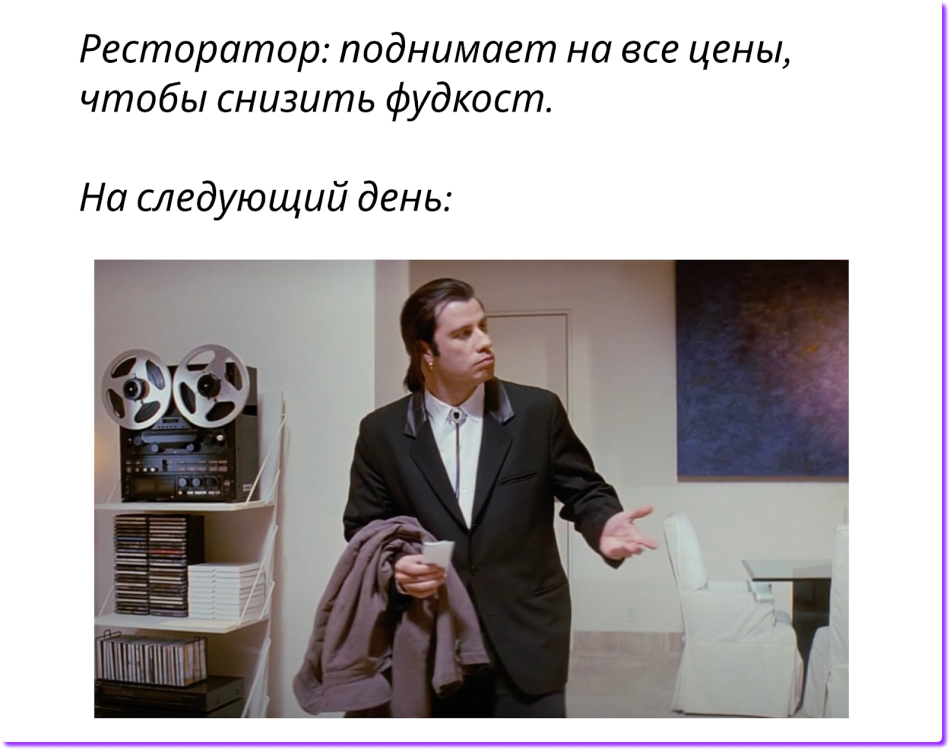 Еще нужно учитывать, что, помимо фудкоста, у заведений много других обязательных затрат: зарплата, коммунальные услуги, маркетинг. И если ресторатору удается стабильно сохранять низкий фудкост, то у него остается больше денег на постоянные расходы.