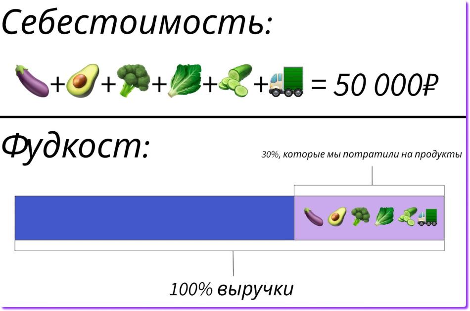 В некоторых статьях фудкостом называют себестоимость, но это не совсем верно. Себестоимость — это сумма, которую заведение потратило на производство блюда, а фудкост — это доля себестоимости в общей выручке