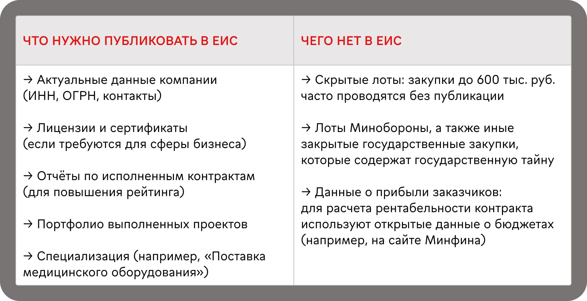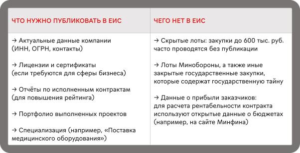 Плюсы ЕИС — это открытая площадка, где есть вся информация по прошедшим торгам: кто был заказчик, какой был предмет закупки, кто выиграл контракт, какой был торговый вид (аукцион или запрос котировок), какая начальная максимальная цена контракта, какие основные поставщики в нужном регионе.