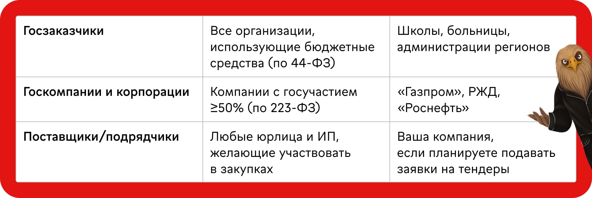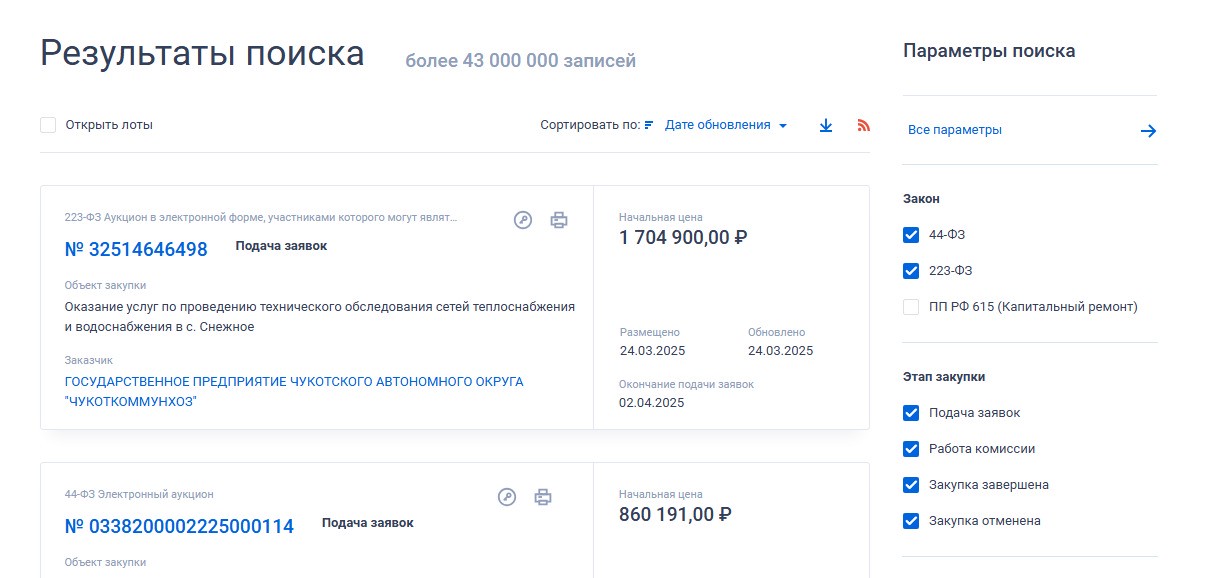 Все закупки госучреждений, госкомпаний (Газпром, РЖД) и фондов ЖКХ публикуются в одном месте.