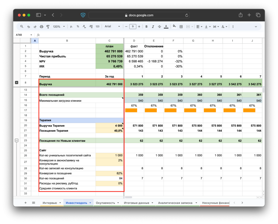 В финмодели все главные показатели выводятся на отдельную вкладку, где можно оценить эффективность и жизнеспособность проекта: