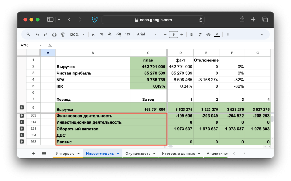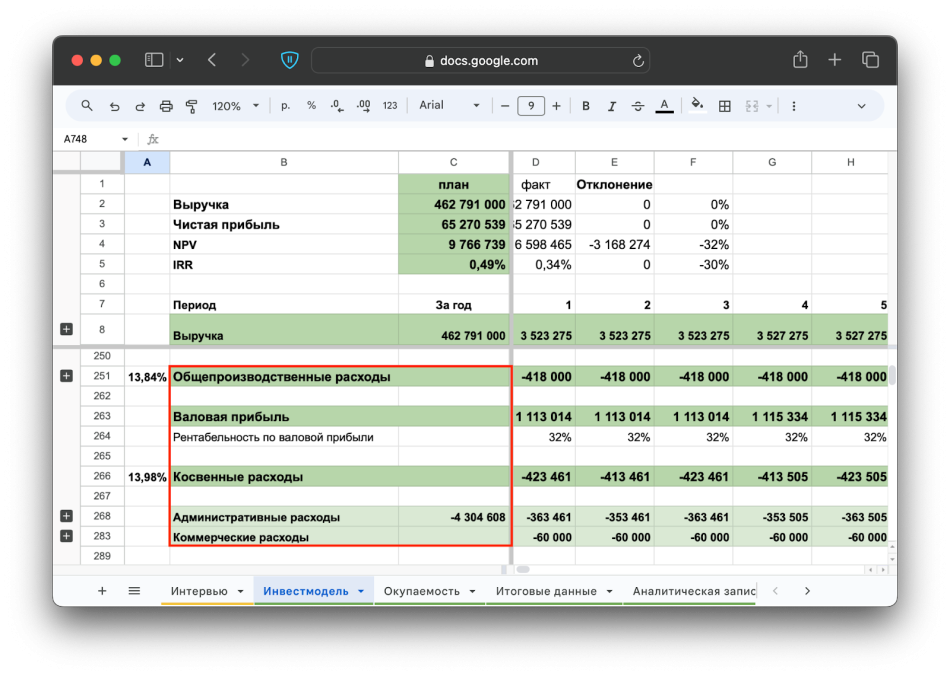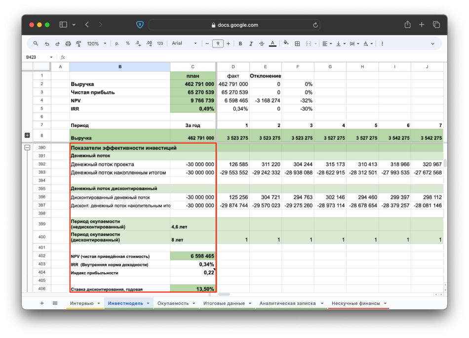 Но если без стандартной финмодели никуда, то финмодель инвестпроекта — важна вдвойне. Она показывает, сколько денег нужно вложить в предприятие, через сколько инвестиции окупятся и какую прибыль принесут. Если не знать этого, можно начать заведомо убыточное предприятие.