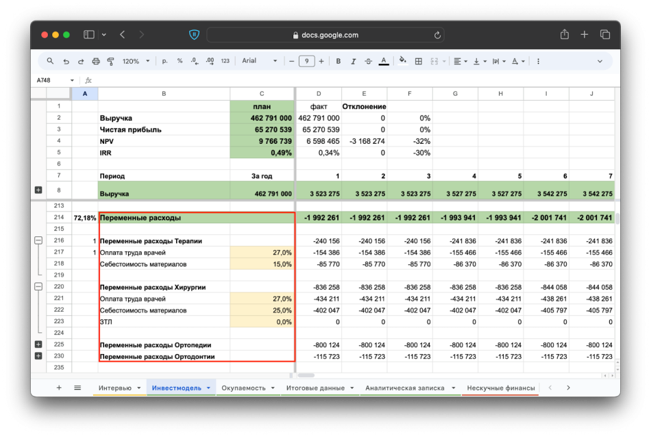 На скриншоте мы видим, что инвестиции в стоматологию при текущей выручке и расходах дадут инвестору такие результаты: