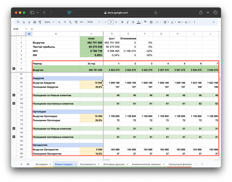 Инвестиционный проект может быть в разной сфере, например, в строительстве или медицине. Дальше в статье будем работать с инвестиционной финмоделью стоматологии. Ее составил финдиректор НФ для предпринимателя, желающего купить готовую стоматологию.