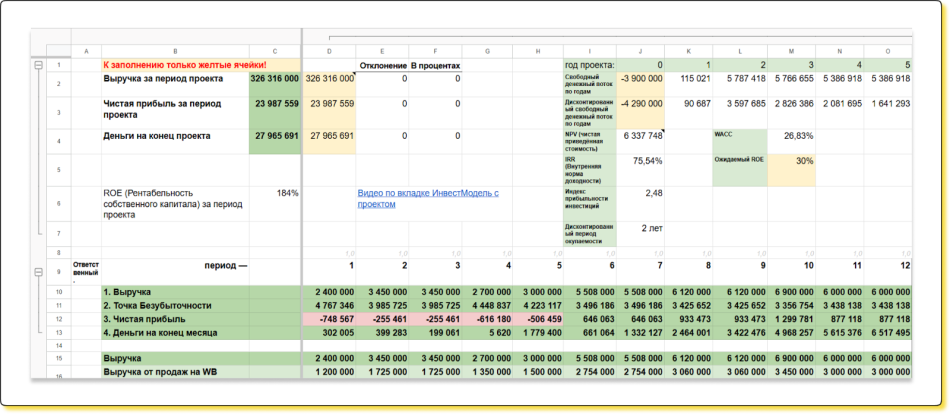 Шаг 1. Рассчитать денежные потоки. Это деньги, которые принесет инвестиционный проект. Для этого в финмодель вносят данные: