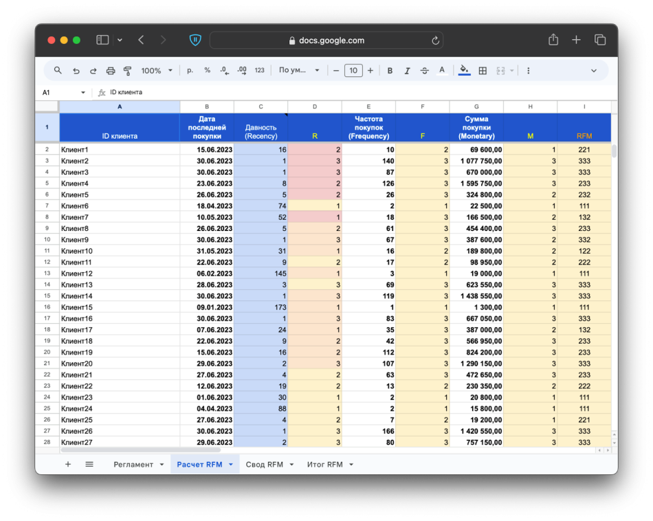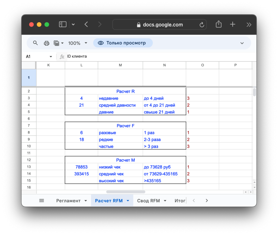• M — сумма покупок. Например, у нас низкий чек — до 73 628 ₽, средний чек — от 73 629 до 435 165 ₽, а высокий — больше 435 165 ₽.