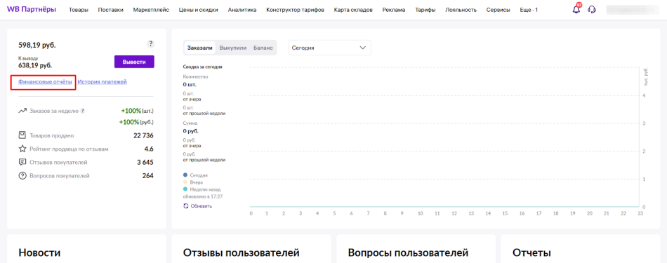 В личном кабинете селлера откройте главную страницу https://seller.wildberries.ru/ и перейдите в раздел «Финансовые отчеты».