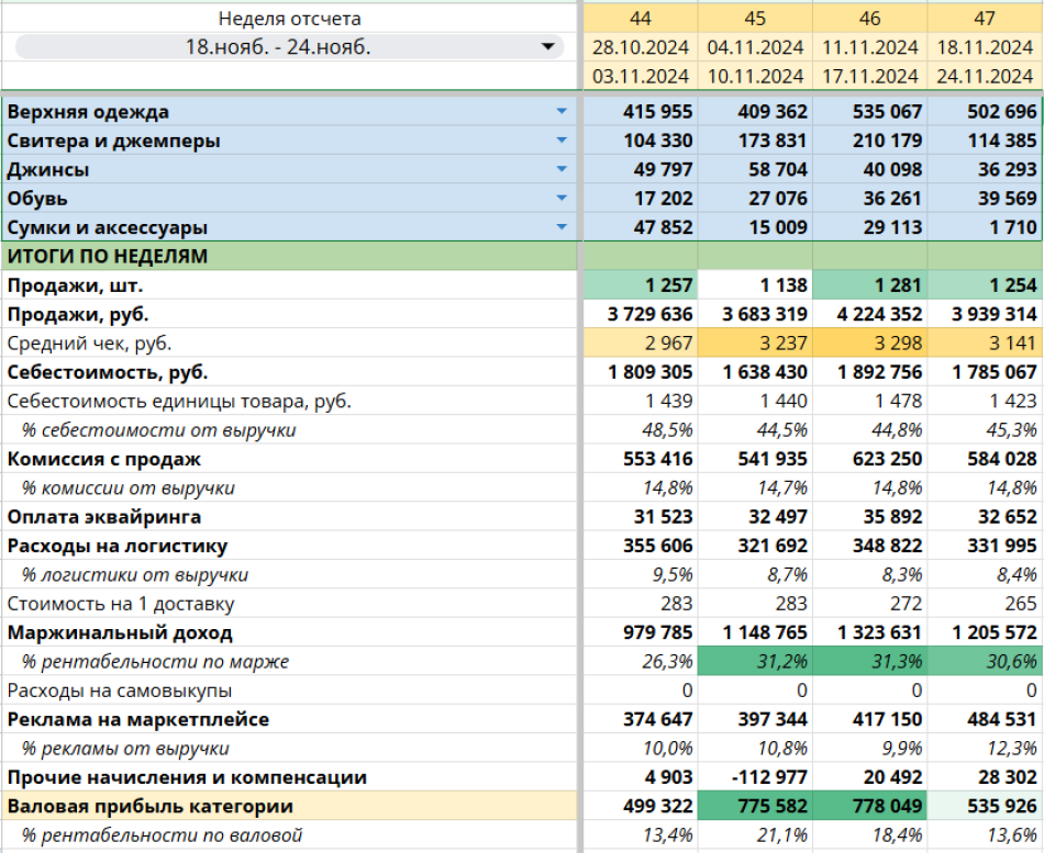 Теперь можно смотреть структуру расходов на логистику, хранение, продвижение, эквайринг и оценивать рентабельность по прибыли. Важно, чтобы по итогам еженедельных данных были не только подсчитаны доходы и расходы, но и были видны ключевые тренды на всей цепочке продаж.