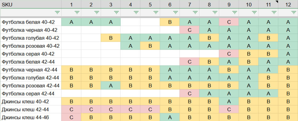 Можно использовать некую «тепловую карту». В январе товар относился к категории А, в феврале — к категории А, а в марте он переместился в категорию B. А в следующем месяце попал в категорию C.