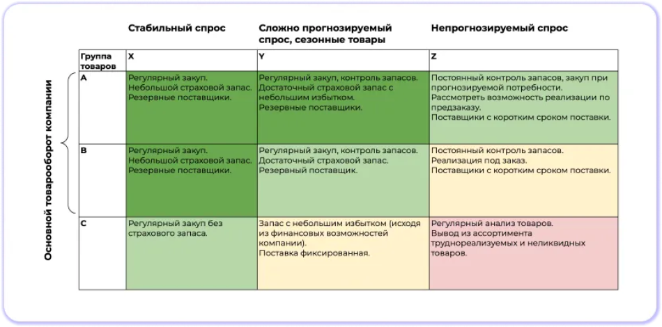 CX, CY, CZ — товары, которые приносят мало прибыли. Часть этих товаров со стабильным спросом — ее нужно контролировать, чтобы не было лишних запасов, а часть с нестабильным спросом вообще можно вывести из ассортимента.