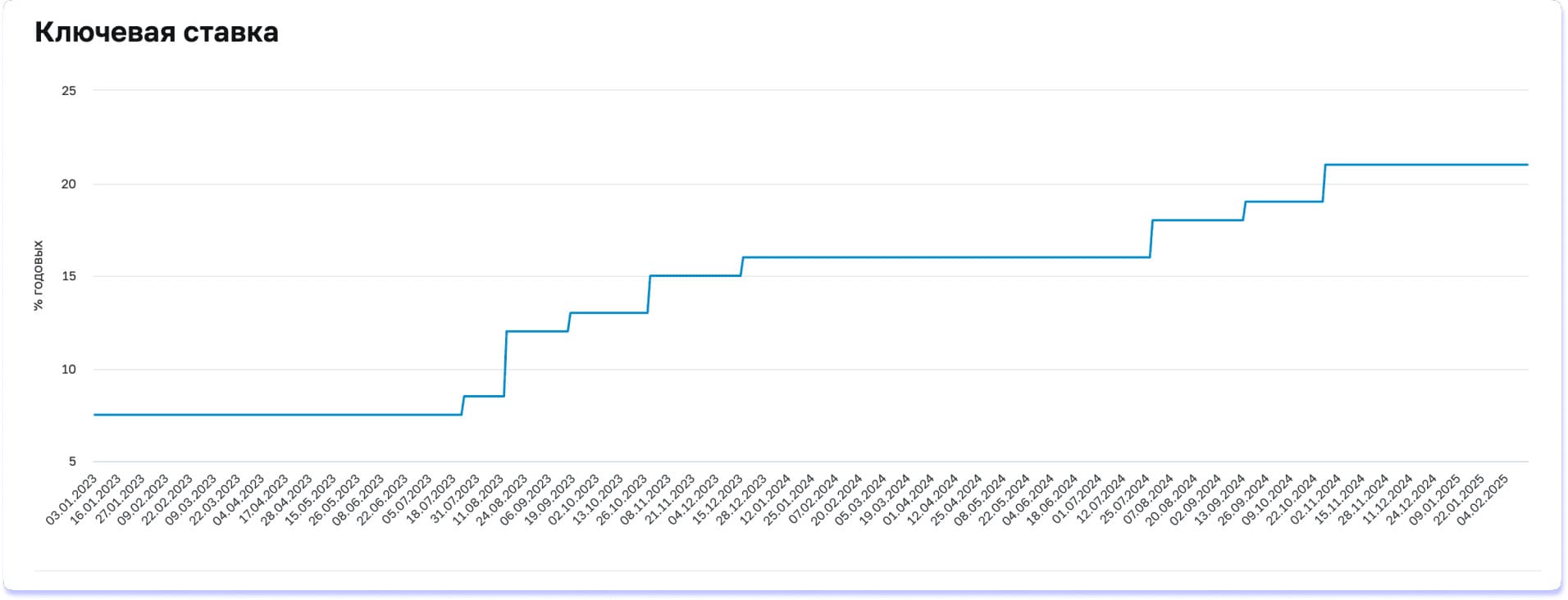 Центробанк устанавливает ключевую ставку на регулярных заседаниях, которые проходят 8 раз в год, а также на внеплановых встречах. Так, начиная с 2023 года по февраль 2025 года ключевая ставка менялась восемь раз: с 7,5% до 21%.