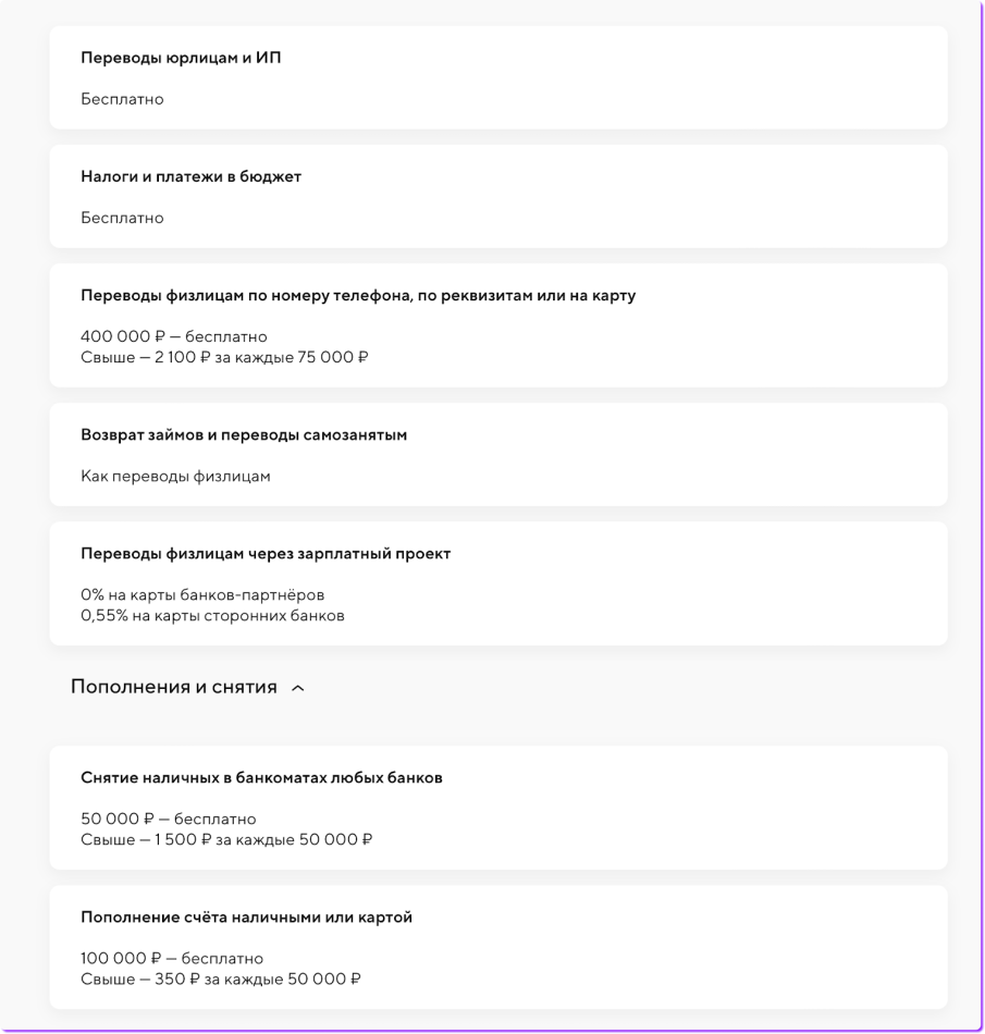 Лимиты банка на вывод денег со счета ИП зависят от тарифа. На скрине — тариф «Начало» с лимитом переводов на карты до 400 000 ₽. Если выводить больше, придется платить комиссию.