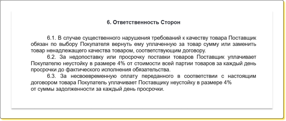 Способ 1. Договариваются и фиксируют процент в договоре. Например, в разделе договора «Ответственность сторон» ↓