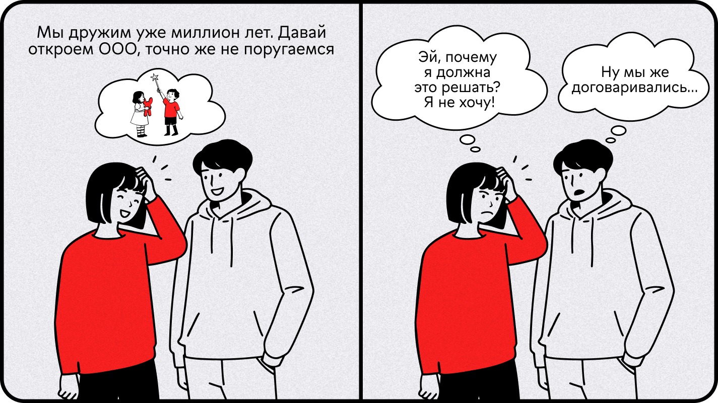 На старте всем кажется, что проблем не будет. Но бизнес меняется, нагрузки распределяются неравномерно, появляются инвестиции, выгорание, разное видение развития. И вот тут устные договоренности перестают работать.