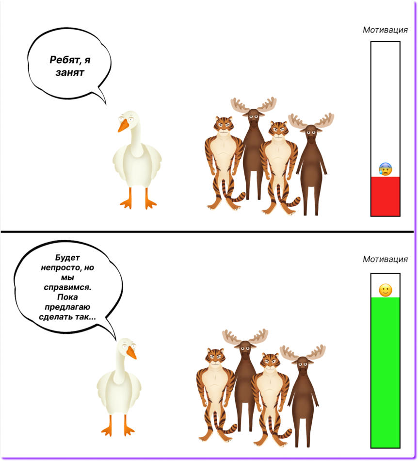Бывает и такое, что собственник каждый день думает, как быстро адаптироваться к новым условиям, но при этом ничего не говорит команде. И хоть он старается во благо, полезно просто поговорить с командой, у которой уже мог появиться огромный снежный ком из неопределенностей