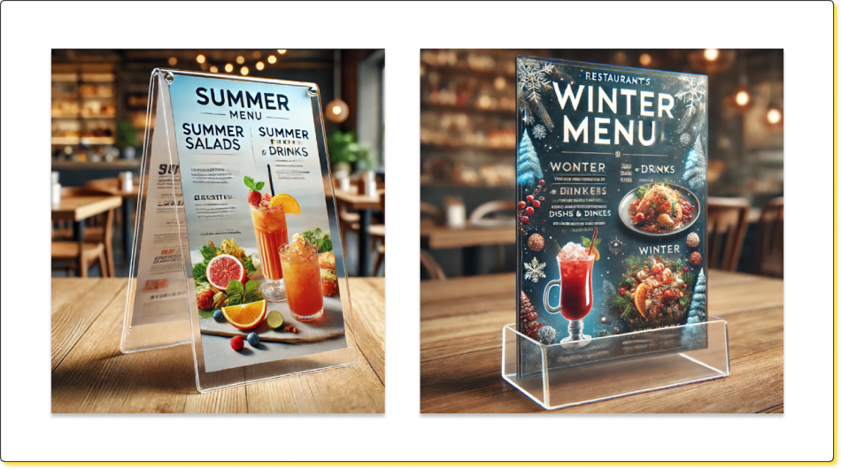Способ 6. Поставить держатели меню (тейбл тенты) на столах и кассе. В них рассказать об акциях — о скидках, сезонных предложениях и проведении мероприятий. Например, вложить в них флаеры о летних напитках, чтобы побудить клиента добавить те в заказ.