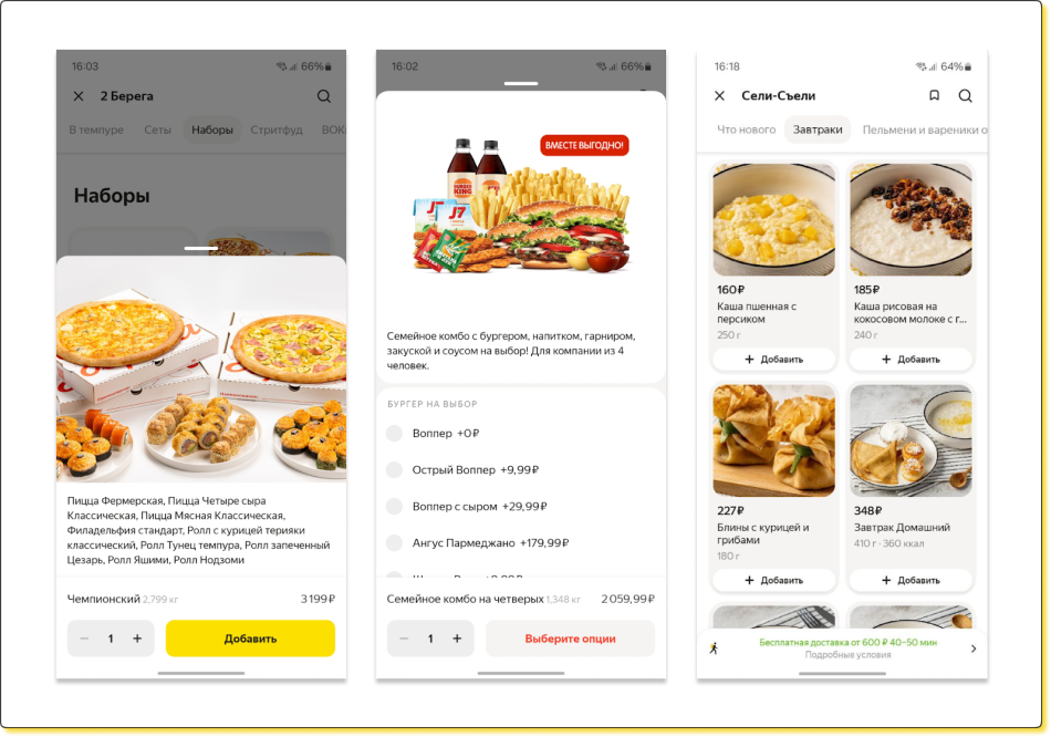 ↑ Комплексные продажи в Яндекс.Еде: у «2 Берега» и «Бургер Кинга» есть наборы для компаний, а у «Сели-Съели» — готовые завтраки.