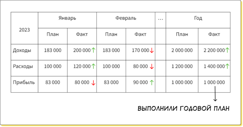 План — то, что бизнес запланировал на период в месяц, квартал или год. Например, план на январь по выручке — 2 млн ₽.