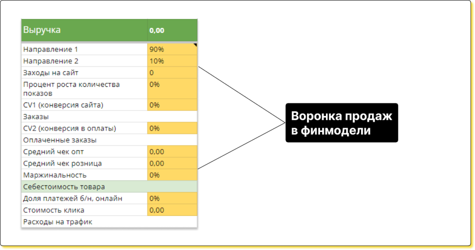 ↑ На финмодели можно декомпозировать выручку до количества заказов, среднего чека, маржинальности, прямых и косвенных расходов, а также чистой прибыли