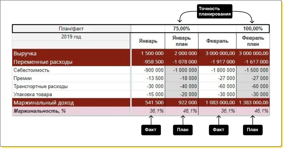 Точность планирования — это показатель, который помогает анализировать выполнение планов. Для этого бизнес сравнивает факт с планом и смотрит, насколько они различаются в процентах.