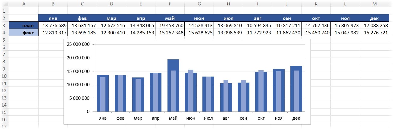 Диаграмма, где столбики показывают плановую и фактическую выручку за месяц, а линия — кумулятивное отклонение за квартал. Такая наглядность мгновенно показывает проблемные зоны.