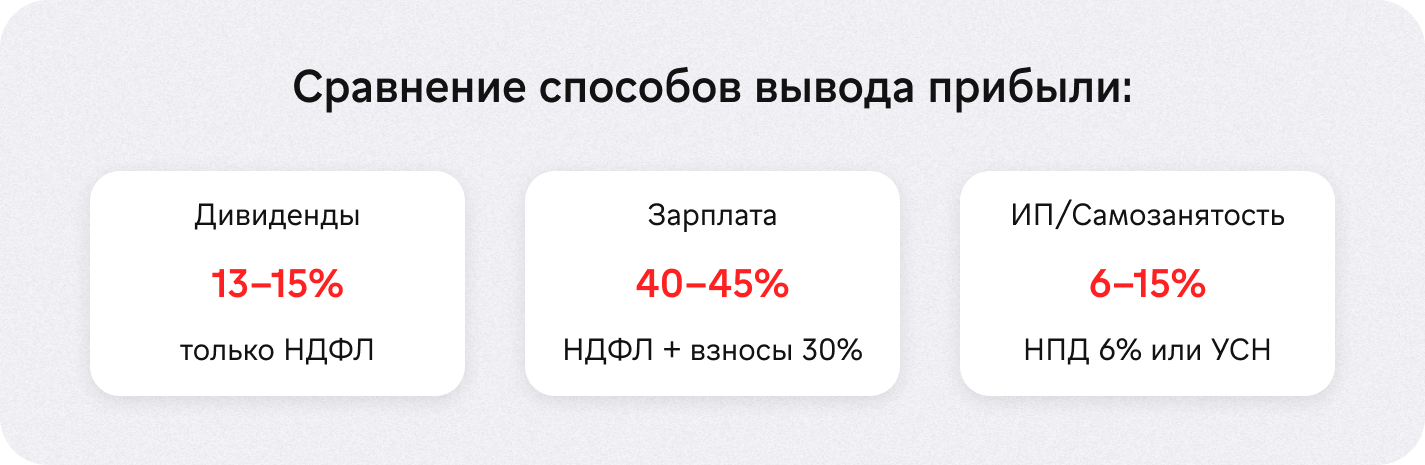 Дивиденды — самый частый и безопасный вариант. Процедура: решение участников, налог 13-15% (НДФЛ).