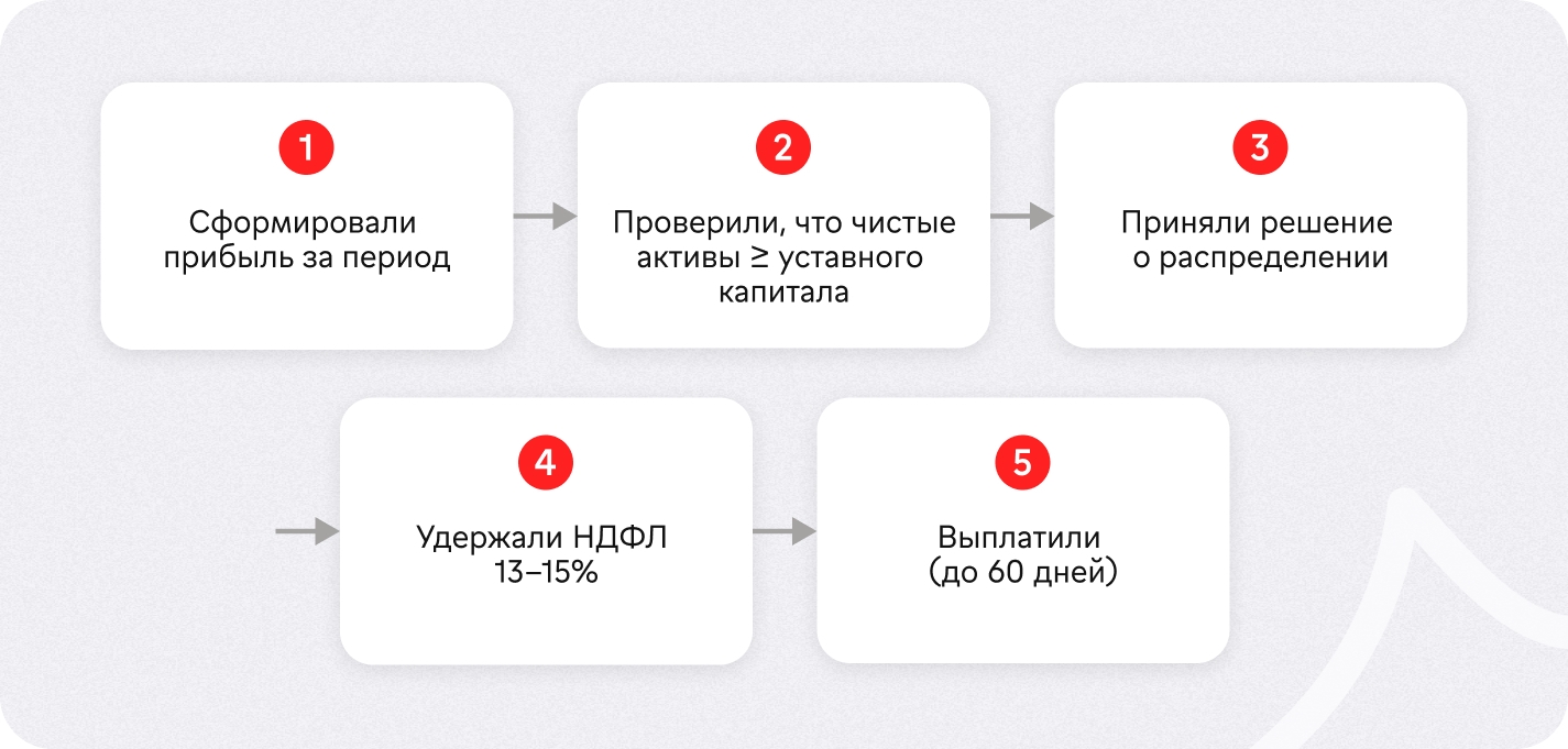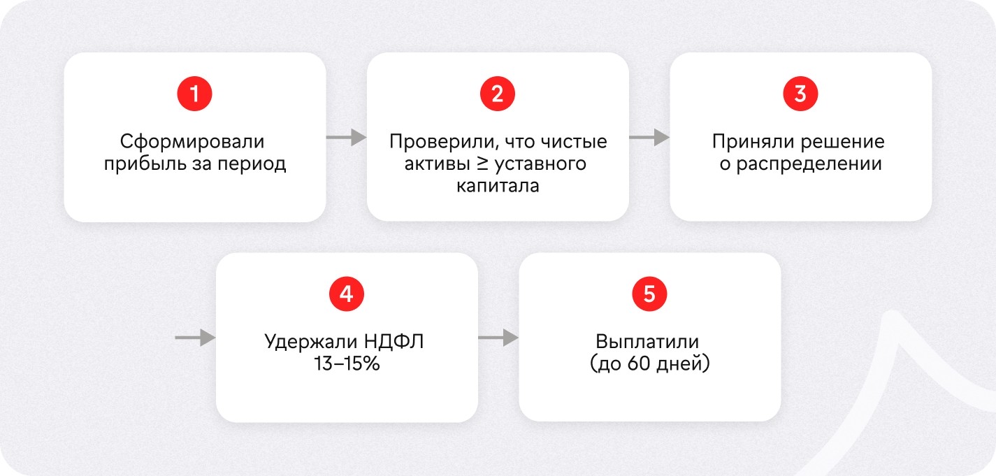 Периодичность: можете выплачивать дивиденды раз в квартал, полгода или год. Закон № 14-ФЗ запрещает делать это каждый месяц — только три варианта.