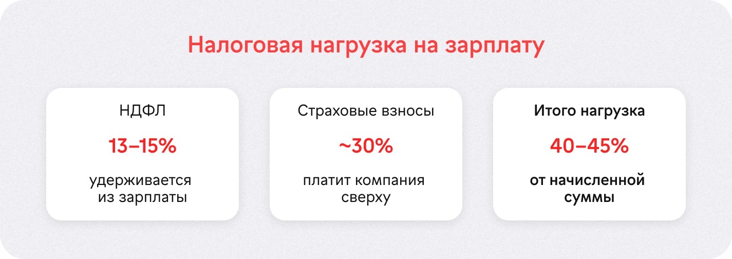 Чтобы получить на руки 100 000 рублей, компании нужно заплатить примерно 145 000 рублей (100 тыс. зарплата + 15 тыс. НДФЛ + 30 тыс. взносы).