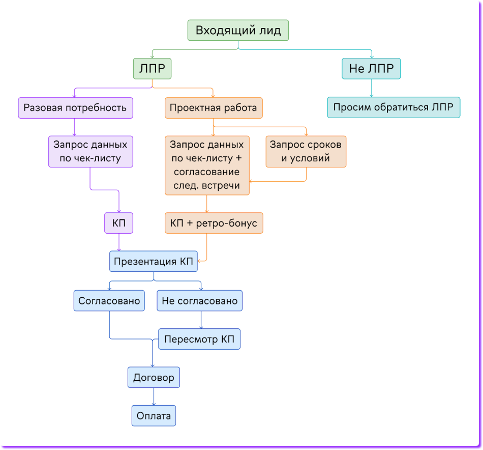 Прописать регламент. Например, для отдела продаж определить, как общаться с клиентами, что предлагать и на каком этапе, какое у продукта УТП. Для удобства информацию собирают в виде блок-схемы.