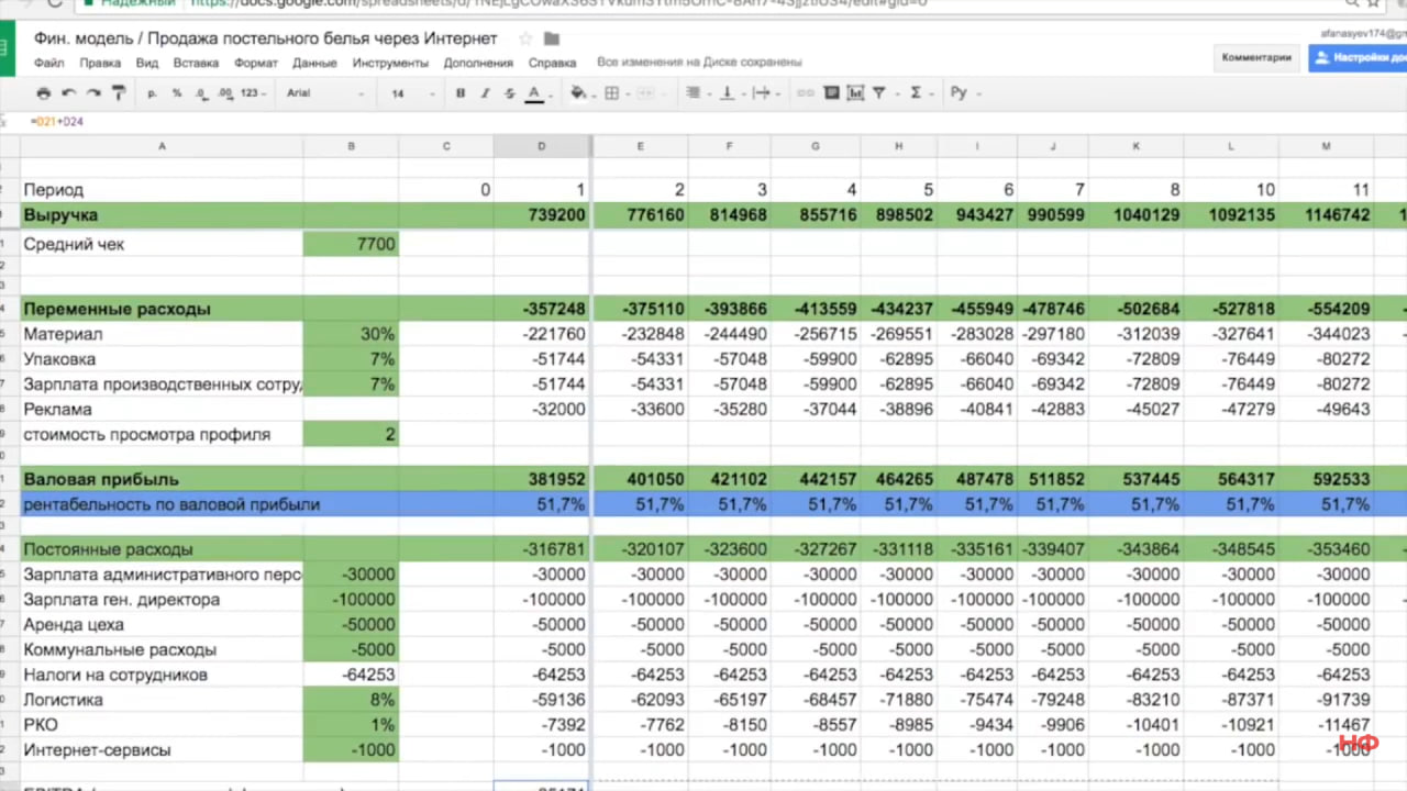 Итак, финмодель компании по производству и онлайн-продажам постельного белья готова!