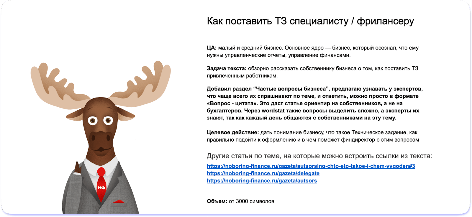 И там и там — техническое задание на статью. Разница в том, что в первом случае его составлял заказчик, а во втором — сам исполнитель. Да, верно, исполнитель тоже может составлять задание: сначала он разбирается в задаче, потом описывает ее в документе и согласовывает с заказчиком. Это еще называют пониманием задачи.