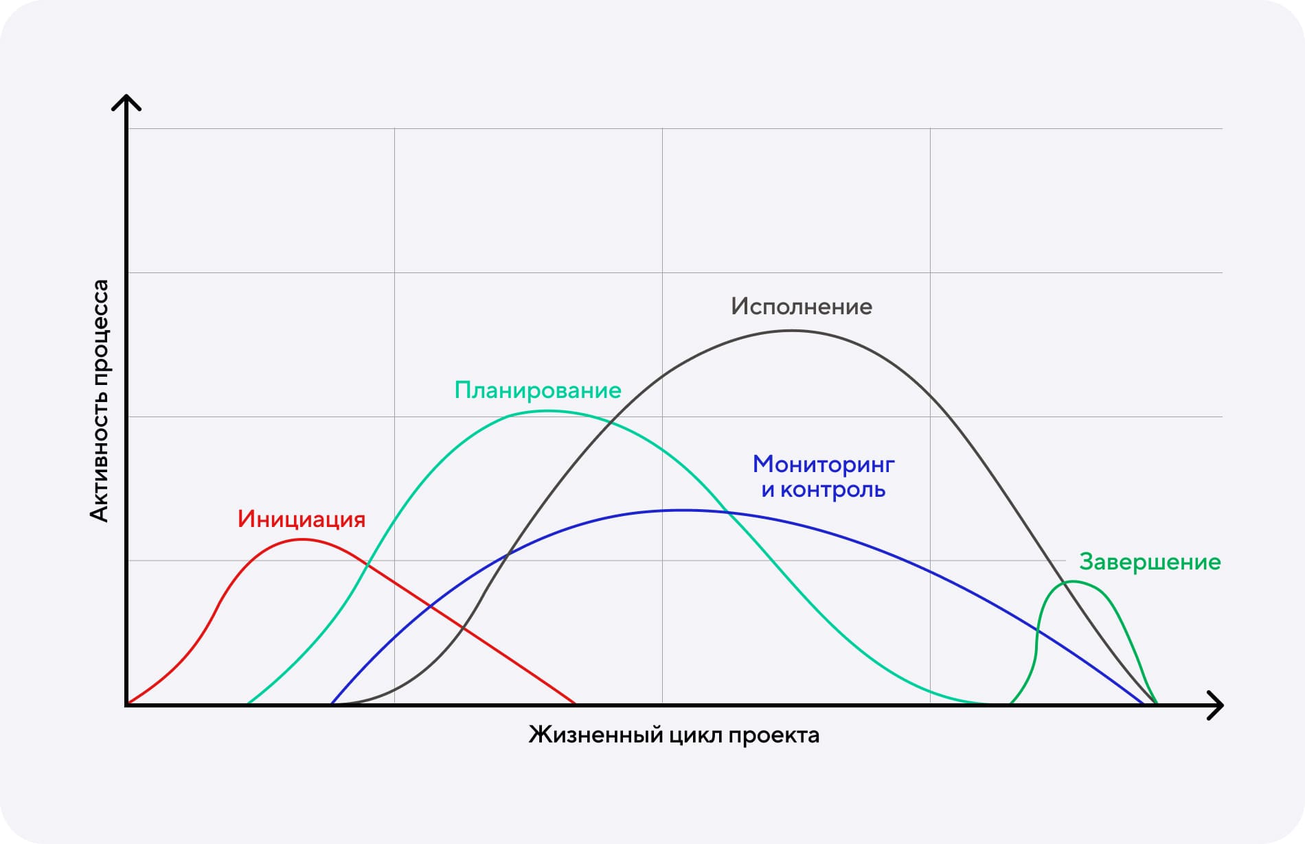 На этапе планирования, когда за дело взялся менеджер, он может управлять всеми процессами. На этапе исполнения часть процессов уходит команде, при этом мониторинг и контроль остается за менеджером. А на этапе закрытия результат работы принимают собственники или топ-менеджеры, поэтому эти процессы закрепляются за ними.