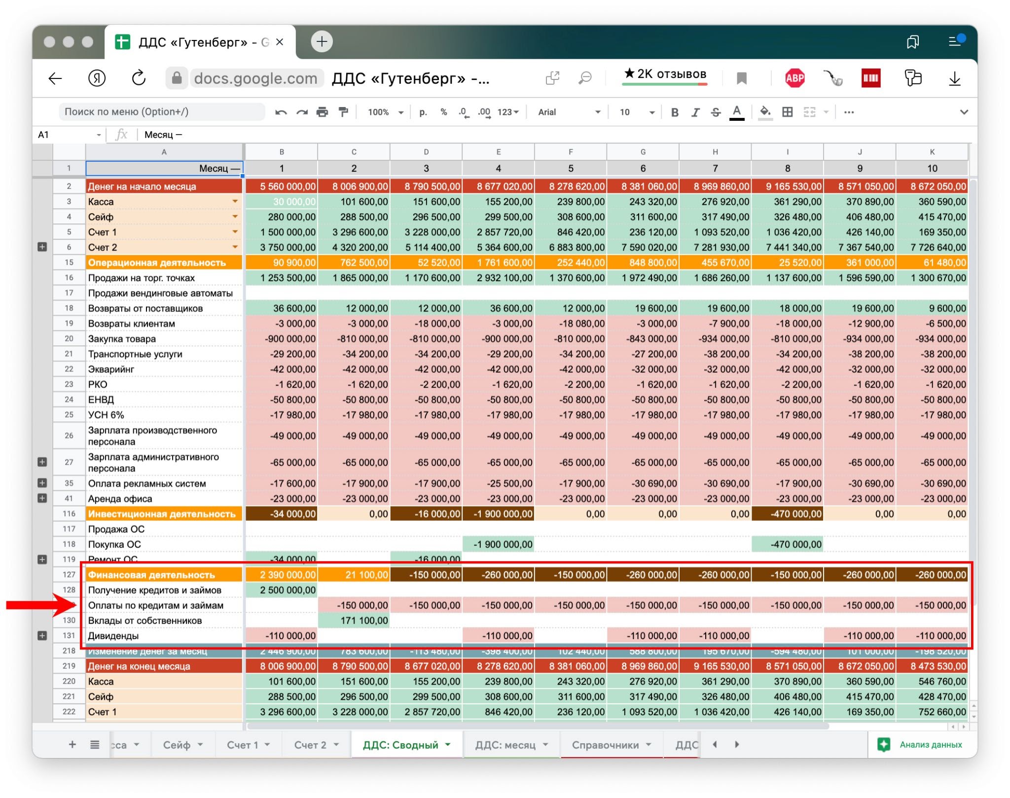 Так отчет ДДС с разбивкой по видам деятельности расставил всё на свои места: оказалось, что в минус типографию тянул поток по финансовой деятельности — дивиденды и выплаты по кредитам. Собственник вытаскивал на себя слишком большие суммы, что в сочетании с кредитами приводило к кассовым разрывам. А вот поток по операционной деятельности был в полном порядке — это значит, что бизнес еще можно спасти.